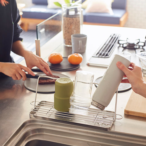 水筒やコップ以外にも、まな板、大きなお皿、フライパンなどの臨時水切り場としても大活躍。使わないときはコンパクトにたたんで、キッチン台のちょっとした隙間に収納できます。