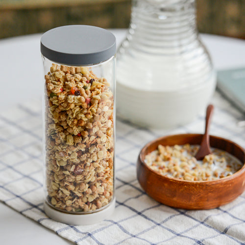 「先入先出ができるガラス製のキャニスター」は、上下にフタがある、新しい発想のキャニスターです。中身がなくなりそうでも、古いものが残っていると使い切るタイミングを見計らう必要がありますよね。ちょうど忙しいタイミングで、中身が空になってしまうことも…。