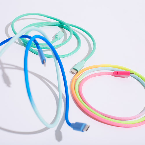 デスク周りは、充電ケーブルだらけになることもよくあります。コードはどれも同じような見た目をしているから、「これ、何につながってるんだっけ?」とわからなくなることもしばしば。コードをたどってどれか探していては、ちょっと時間のロスですよね。その問題、レインボーカラーの「充電が楽しくなるiPhoneケーブル」で、楽しく色分けすれば万事解決です。