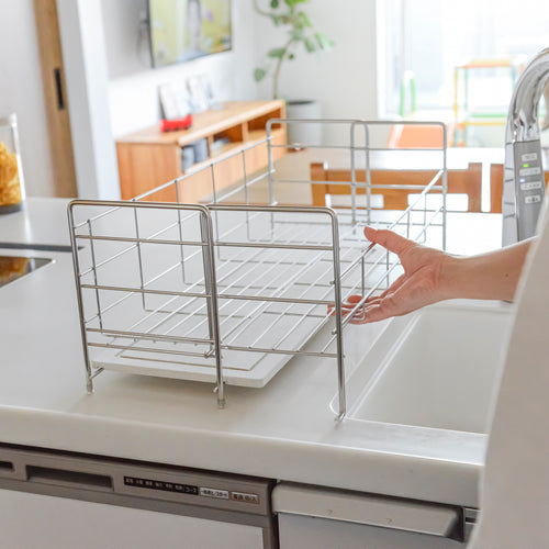 ちょっとだけ洗い物したいときはコンパクトに、たくさん洗い物があるときはワイドに。シーンに合わせてちょうどいいサイズになる「伸縮する水切りラック」です。必要なときだけスライドして容量をアップできるから、作業スペースを確保しやすいんです。