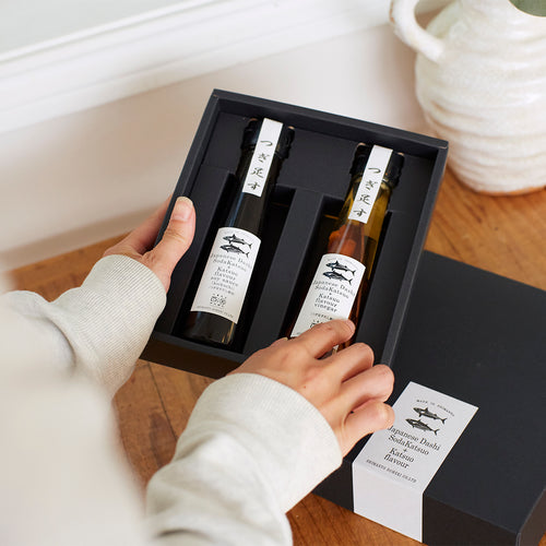 貴重な材料を惜しみなく使うことで、醤油は深くてコクがあり、お酢はカドが取れてまろやか。それぞれ単品で使っても素材の良さが引き出され、2つをあわせて酢醤油や三杯酢にしても絶品です。約10回はつぎ足して使え、長くその味を楽しんでもらえます。ボトルもおしゃれで、黒いマットな箱は高級感もありますよ。