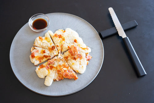 ハッシュド餅ベーコンチーズ×まな板になるお皿&サヤ付きミニナイフ