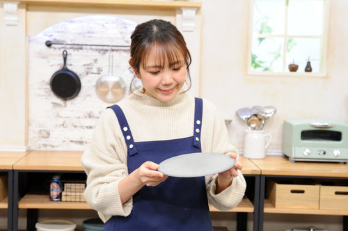 絶対無理そうやのにレンジOKなのにびっくりしました。“レンジにかけられるストーン風プレート”ってコンセプトだけでも売れそう(笑)でもそこよりも、この上で切っていいっていうところが売りなんですよね。キズつきにくい強い素材やし、ちょっとくらいキズついても逆に味があるようなデザイン。食洗機もOKやし、便利さとおしゃれさを兼ね備えてるのがいいですね。あと薄くてフチがほぼないし、割れへんから、隙間にスッと立てて収納できるのもいい!